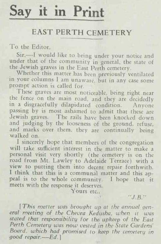 1934 ‘Say it in Print EAST PERTH CEMETERY’, The Westralian Judean (Perth, WA : 1924 – 1925; 1929 – 1955), 1 July, p. 13. , viewed 07 July 2025, http://nla.gov.au/nla.news-article260742171